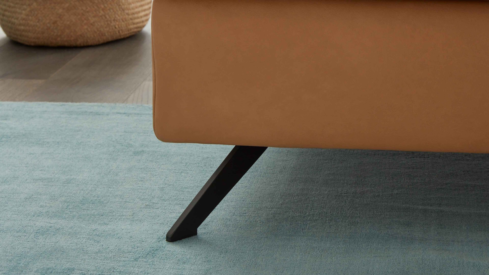 Das Ecksofa aus der Modulmaster-Polsterserie MM-PN1161 kombiniert honigfarben pigmentiertes Glattleder mit mattschwarzen Metallfüßen. Es strahlt ...