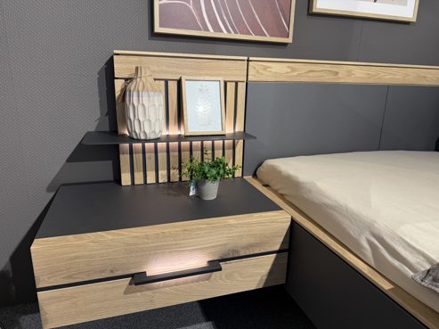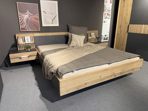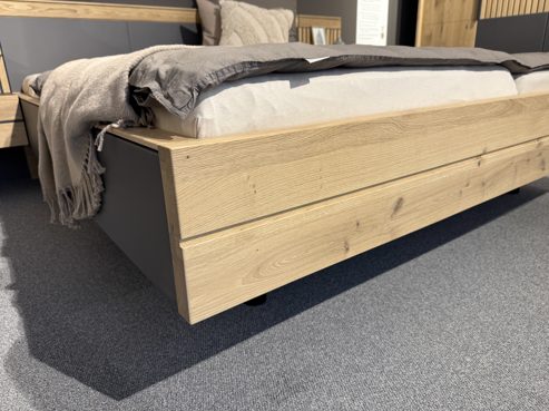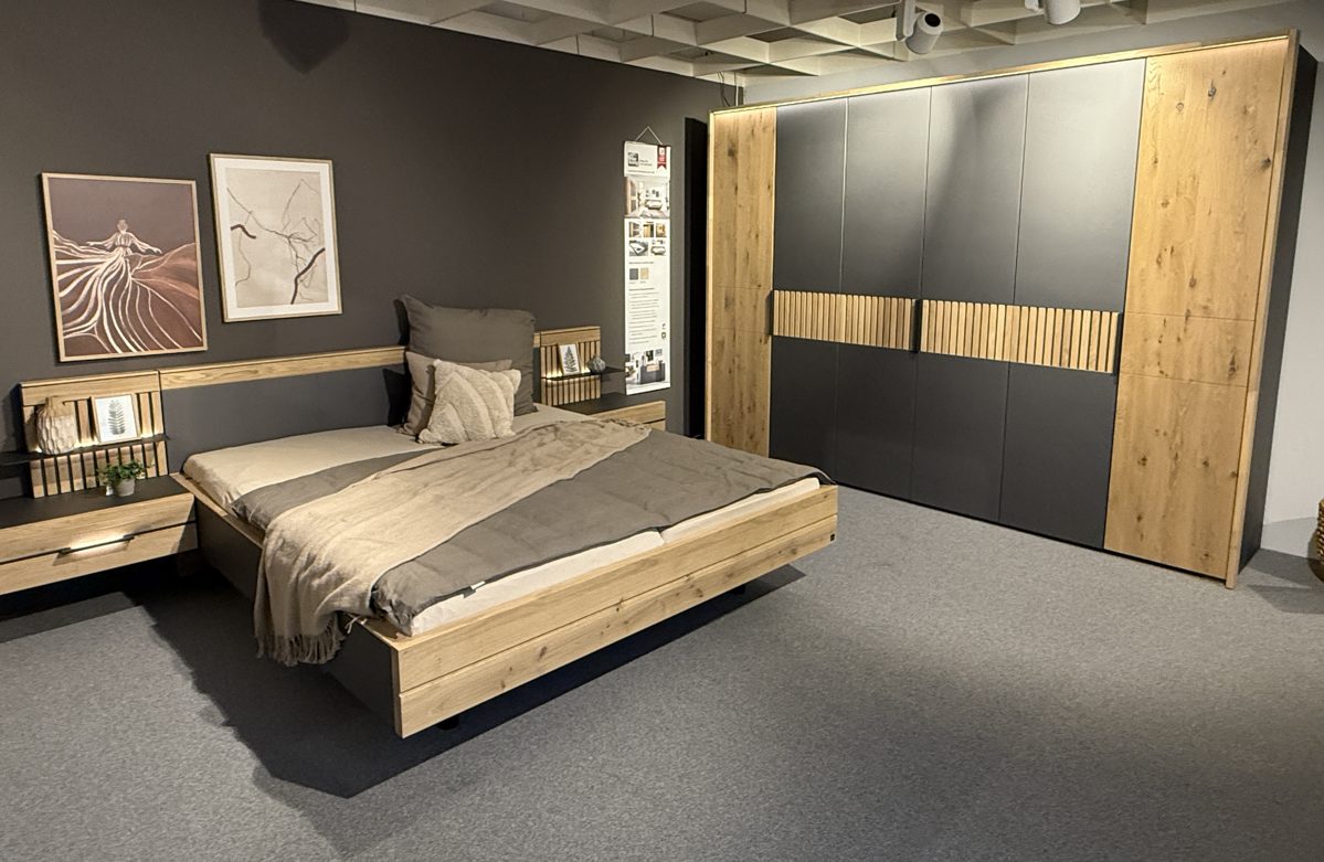 Das Komplettzimmer 528001 aus der Interliving Schlafzimmer Serie 1029 kombiniert Wildeiche-Massivholz mit graphitfarbenem Lack.
