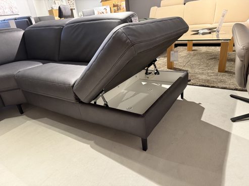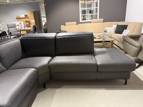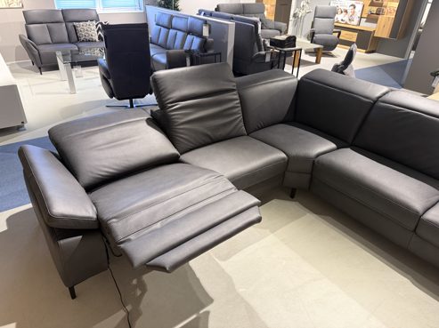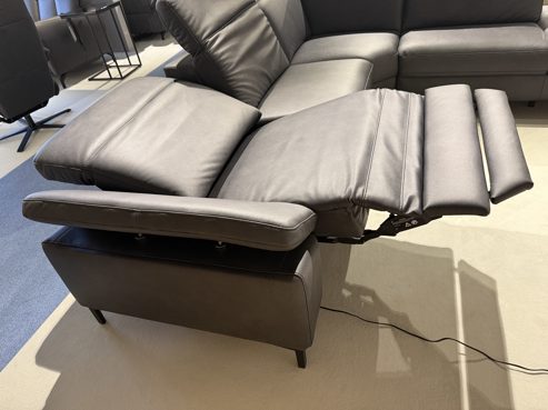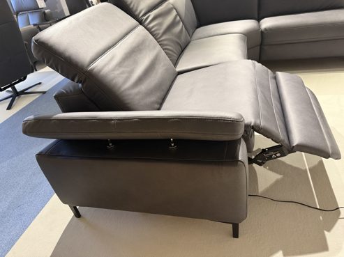 Die schicke Eckkombination besteht aus dem 2,5-Sitzer 2,5LKV mit Armlehne links sowie der Rundecke REKV und außerdem dem 1,5-Sitzer AhoR1,5KV mit offenem Abschluss und Armlehne rechts. Inklusive ist eine manuelle Kopfpolsterverstellung. Per Rasterbeschlag lässt sich das Kopfteil mehrfach in der Neigung anpassen.