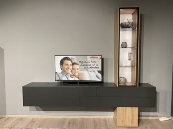Dafür sorgt das Design aus geöltem Casa Wildeiche-Furnier in Kombination mit schiefer-schwarzem Mattlack und Parsolglas in Grau. Das ebenso schiefer-schwarze Metallgestell ergänzt die Optik harmonisch.
