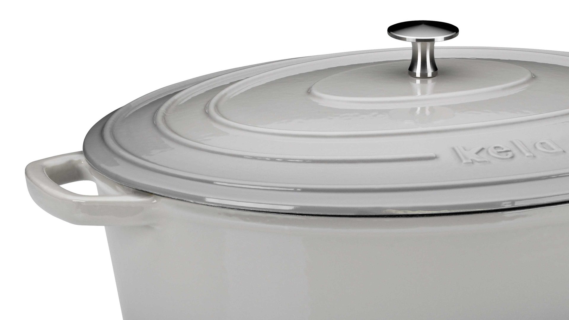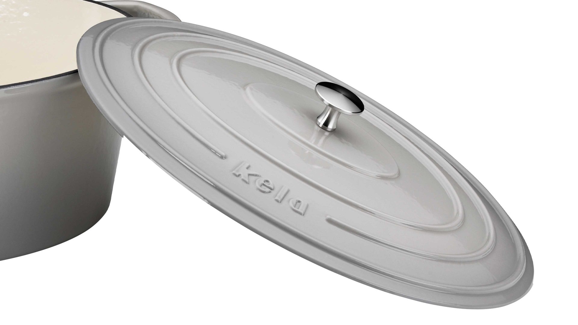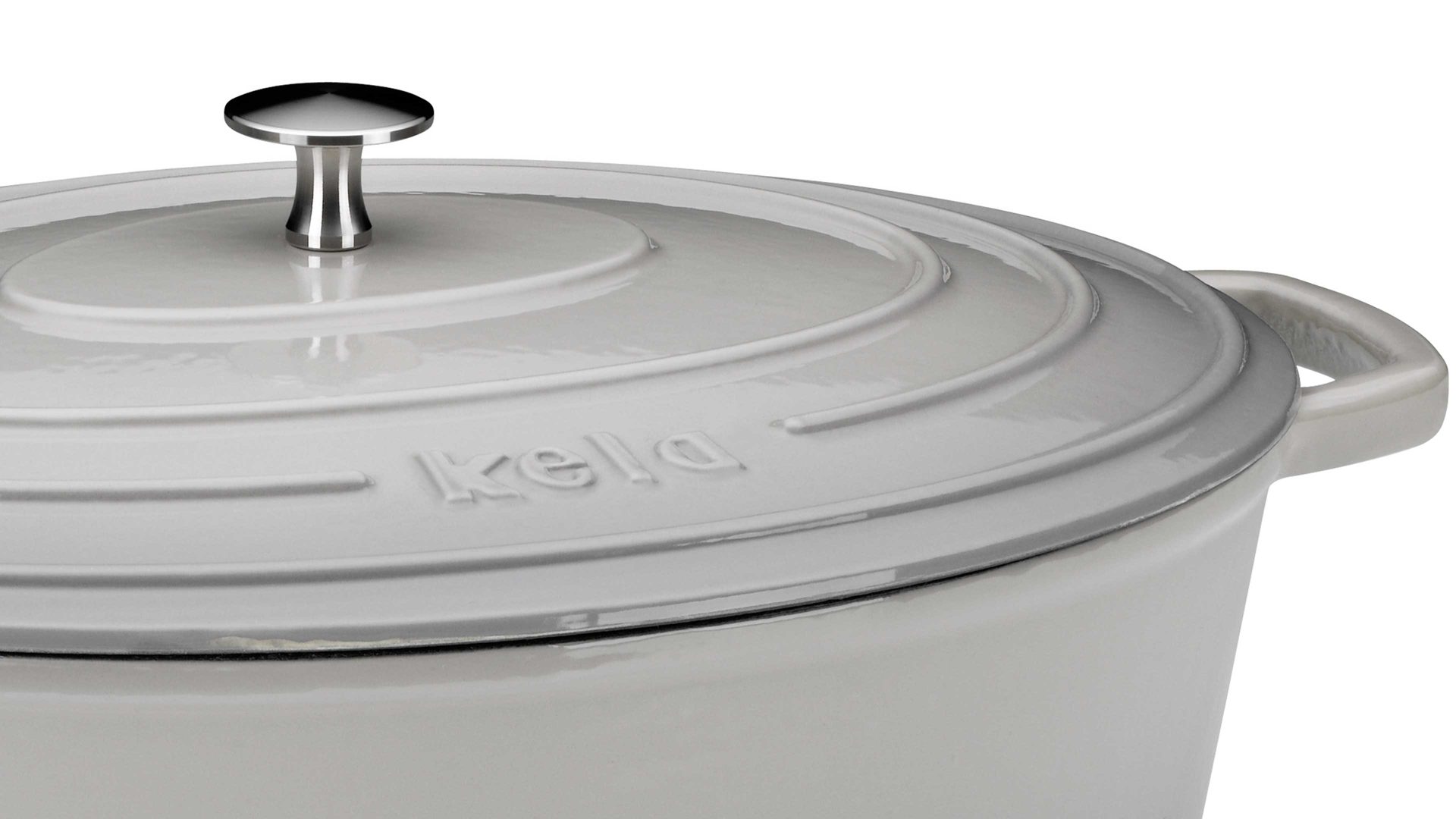 kela Bräter Calido | Gusseisen mit glatter, hellgrauer Emaille-Beschichtung innen und außen | Größe ca. 36 x 15 x 29 (BxHxT) | Bodenfläche ca. 29 x 20 cm (BxL) | Inhalt ca. 9,3 Liter | Edelstahl-Deckelknopf | große Griffe | einfache Reinigung | gleichmäßige Hitzeverteilung | gute Wärmespeicherung | energiesparend | perfekt für Anbraten und Schmoren | backofenfest bis 300 Grad Celsius | für alle Herdarten geeignet, auch für Induktion | zehn Jahre Hersteller-Qualitätsgarantie | in verschiedenen Farben und Größen bestellbar