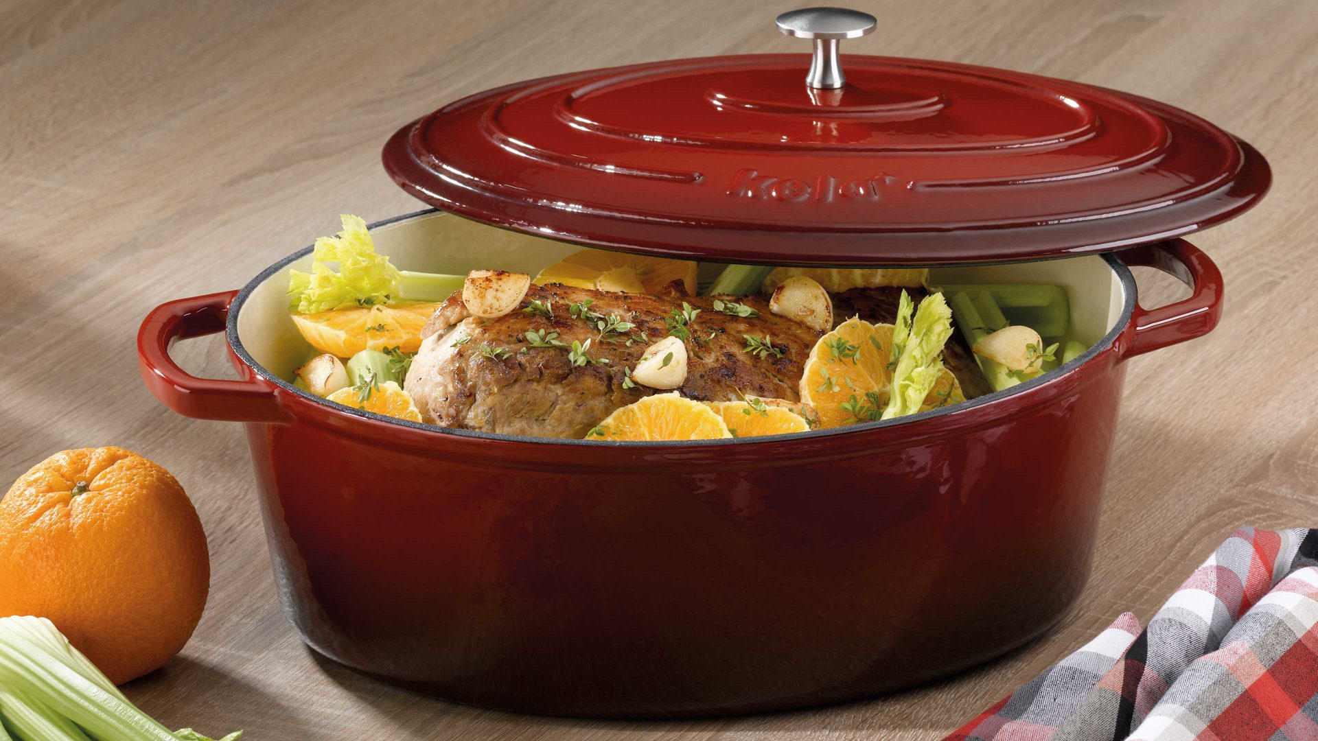 kela Bräter Calido | Gusseisen mit glatter Emaille-Beschichtung innen und emaillierten Rotverlauf außen | Größe ca. 33 x 12 x 26 (BxHxT) | Bodenfläche ca. 28 x 20 cm (BxL) | Inhalt ca. 6 Liter | Edelstahl-Deckelknopf | große Griffe | einfache Reinigung | gleichmäßige Hitzeverteilung | gute Wärmespeicherung | energiesparend | perfekt für Anbraten und Schmoren | backofenfest bis 300 Grad Celsius | für alle Herdarten geeignet, auch für Induktion | zehn Jahre Hersteller-Qualitätsgarantie | in verschiedenen Farben und Größen bestellbar