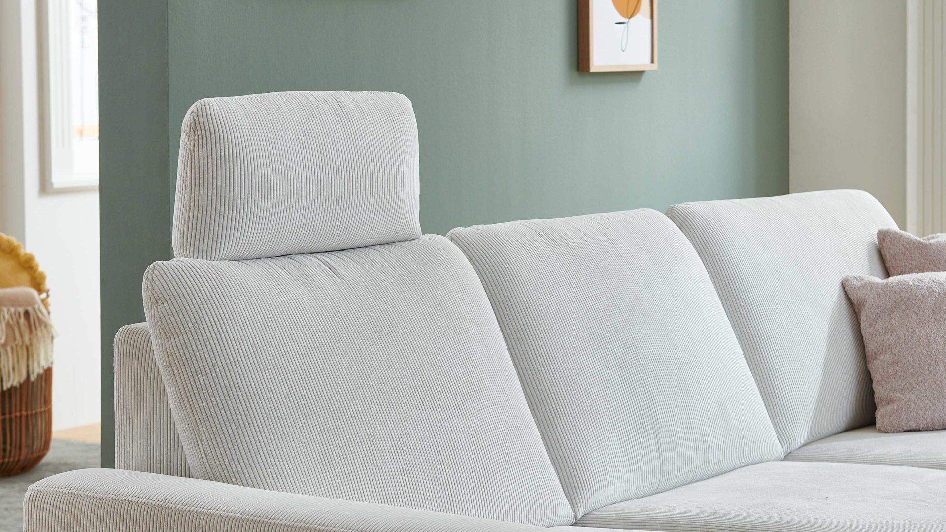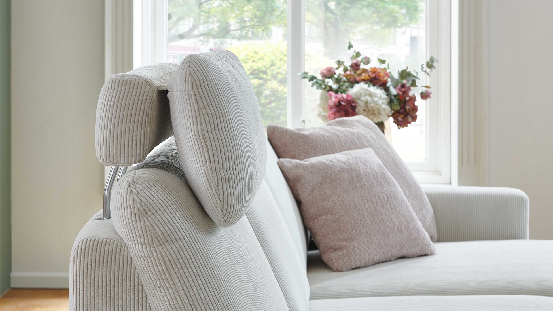 Sie lässt sich manuell in der Höhe und Neigung verstellen. Die mitgelieferte Kopfstützen-Vorrichtung aus robustem verchromten Metall ermöglicht die stufenlose Fixierung der Kopfstütze, deren Maße sich auf ca. 60 x 28 x 23 cm (BxHxT) belaufen. Mit dem naturweißen Feincordbezug harmoniert das Kopfpolster perfekt mit den Couches im gleichen Design.