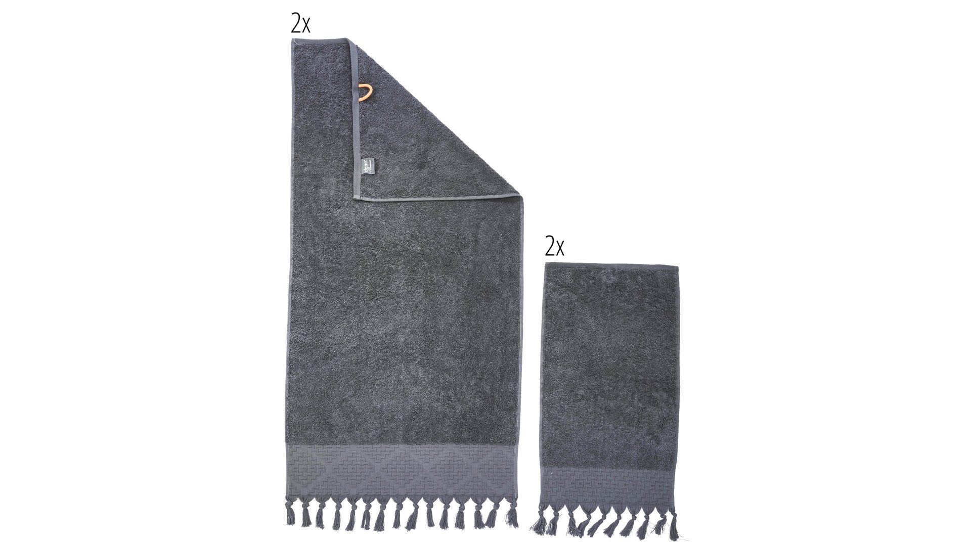 Das anthrazitfarbene done.® Handtuch-Set Provence Boheme enthält gleich vier Heimtextilien in zwei verschiedenen Größen. Freuen Sie sich auf zwei Handtücher mit Maßen von ca. 50 x 100 cm (BxL) und zwei Gästehandtücher mit Maßen von ca. 30 x 50 cm (BxL). Alle Tücher bestehen aus hochwertiger Baumwolle (550 gr/m² Walkfrottier). Sie sind farblich perfekt aufeinander abgestimmt und damit eine dekorative Bereicherung für jedes Badezimmer.