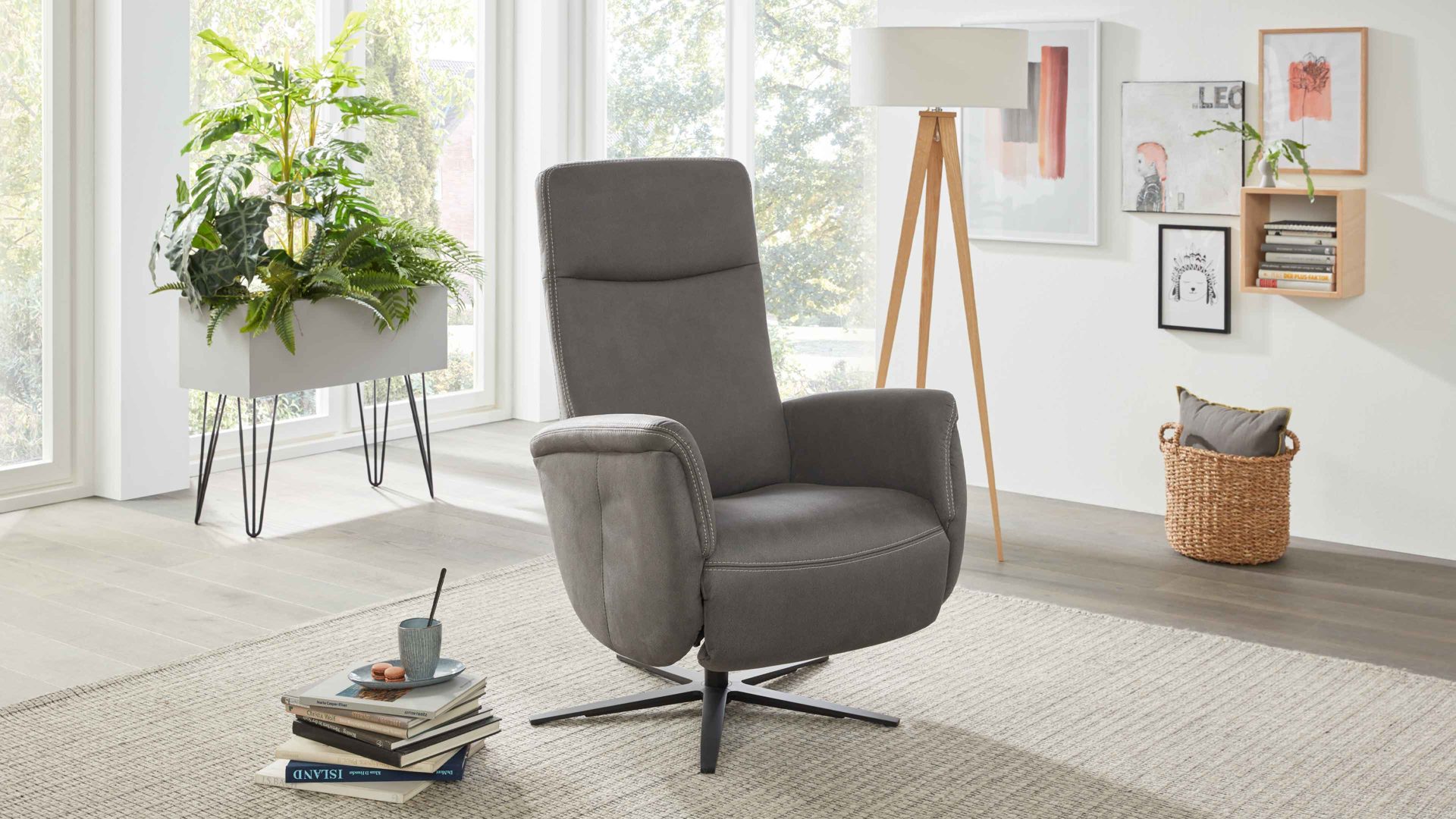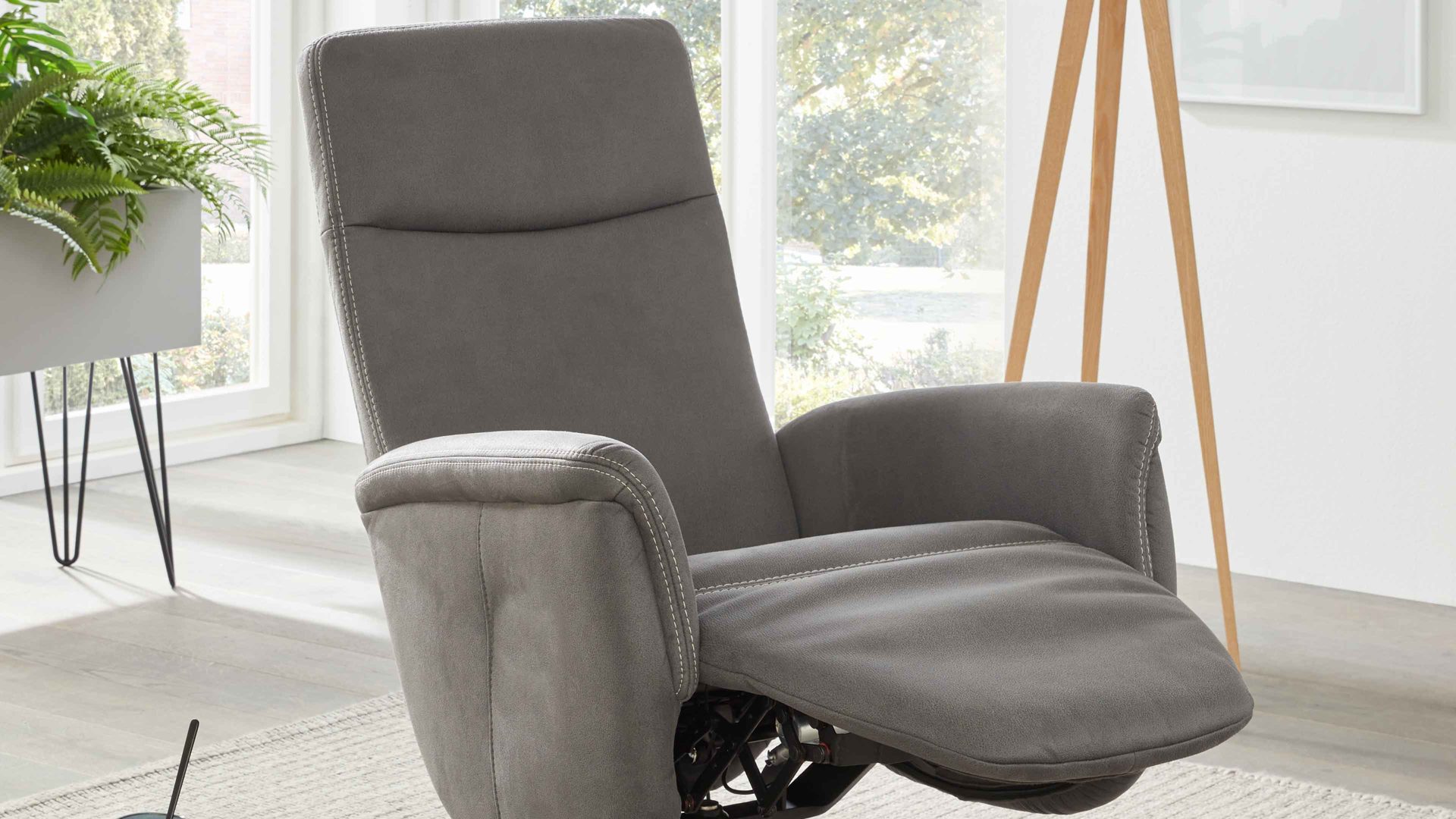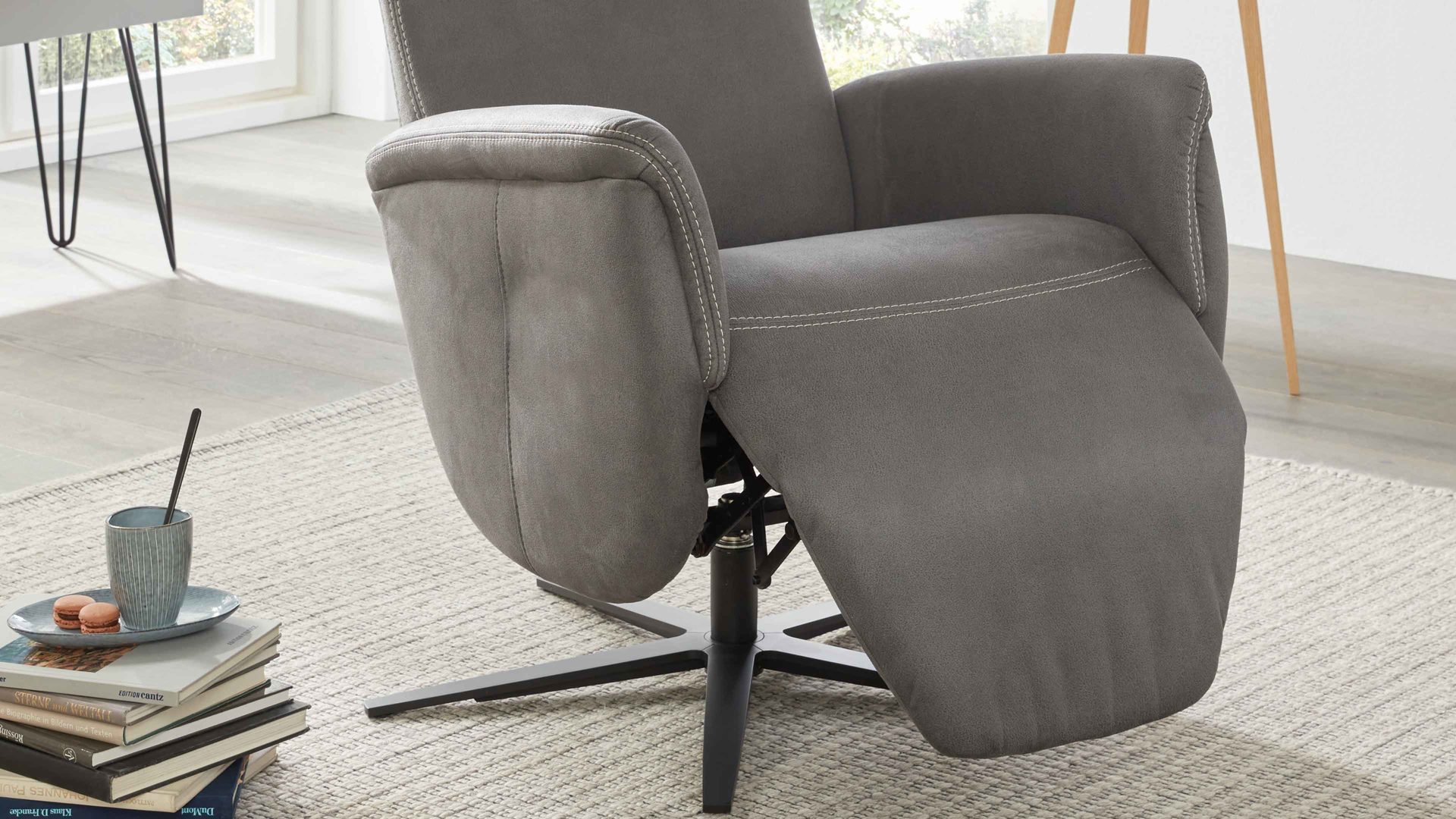 Das Highlight des Sessels bildet die manuelle Relaxfunktion: Leichter Körperdruck führt dazu, dass sich der Rücken senkt. Dabei geht der Sitz automatisch nach vorn und oben. Parallel fährt die Beinauflage nach oben bis in die Relaxposition. Zudem begeistern das stufenlos verstellbare Kopfteil und die Drehbarkeit um 360 Grad.