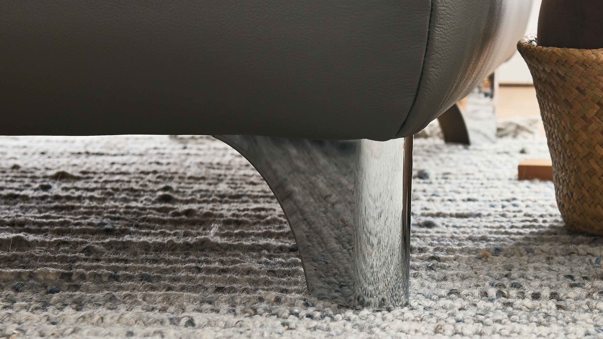 Der XXL-Hocker aus dem Modulmaster-Polsterprogramm MM-PN1078 kombiniert grau pigmentiertes Glattleder mit glänzenden Metall-Winkelfüßen. Er präsentiert sich modern und elegant.