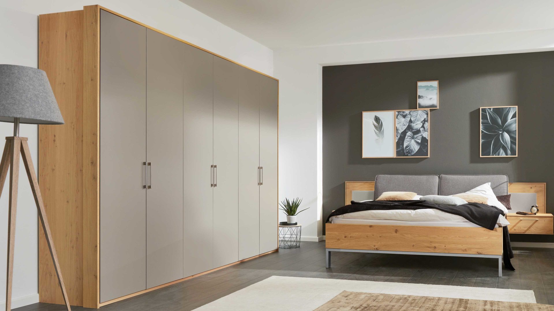 Ein warmer Holzton, ergänzt mit Lackoberflächen in dezentem Taupe, dazu ein Mix aus Klassik und Moderne: das hochwertige Schlafzimmerprogramm bietet Ihnen all diese Komponenten und verbindet sie gekonnt. Für alle, die es lieber natürlich mögen, ist diese Serie auch komplett mit Balkeneiche-Furnier erhältlich. Oder Sie tauschen den Fabton Taupe gegen ein klares Weiß aus.