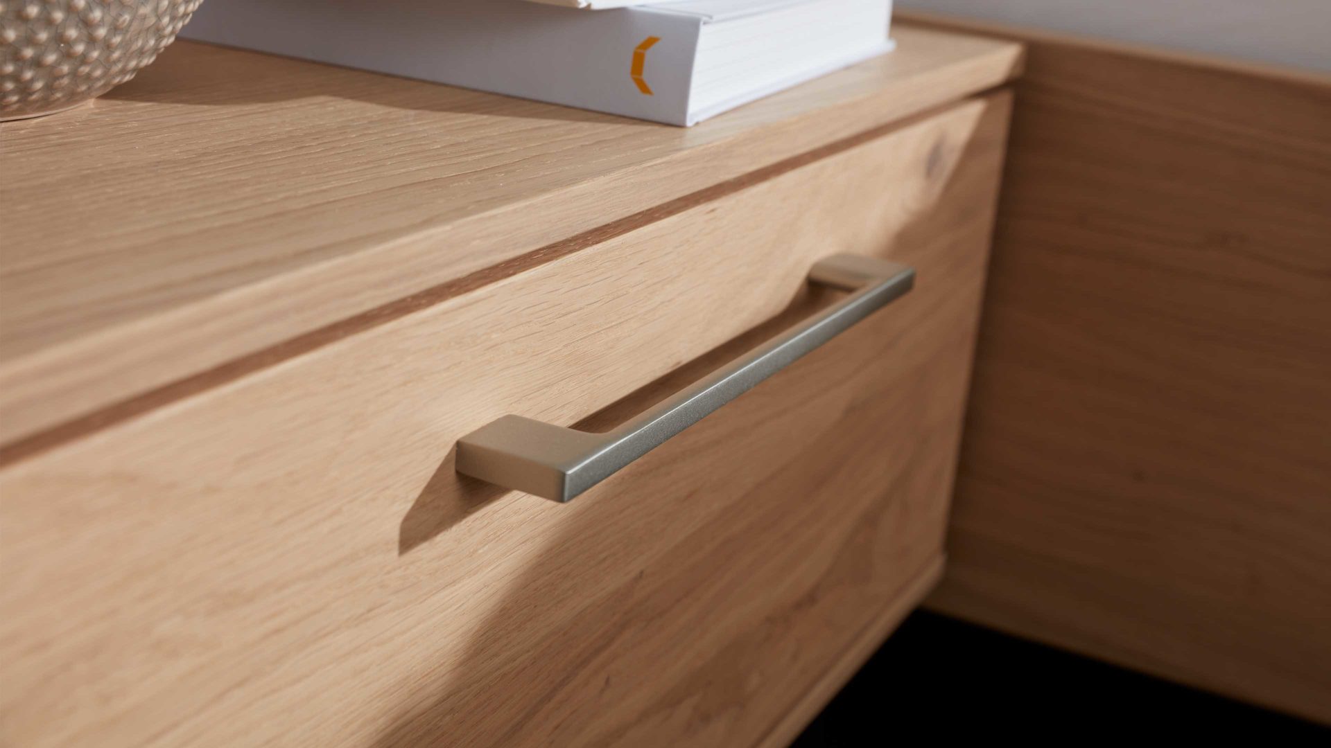 Balkeneiche-Furnier und matte Lackoberflächen im Farbton Taupe vermitteln in Kombination ein warmes Wohngefühl und werden ergänzt von matten Nickelgriffen. Die helle farbliche Gestaltung, die angenehme, zurückhaltende Formensprache, praktische Funktionen und viele Details – dafür steht die Interliving Schlafzimmer Serie 1008.