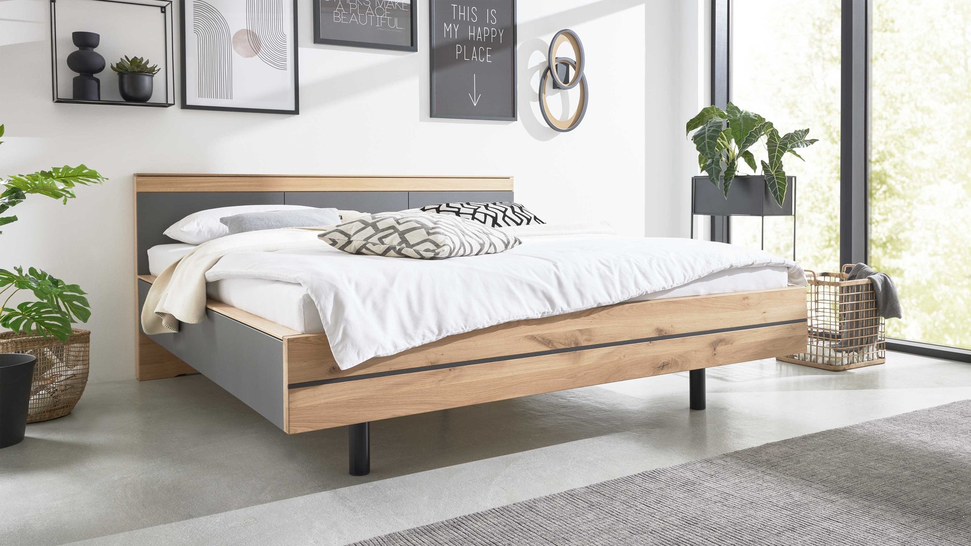 Das Bettgestell harmoniert besonders gut mit den Beimöbeln der Serie 1029 – etwa Hängekonsolen, Paneelen oder dem passenden Kleiderschrank. Durch die Kombination aus Wildeiche und Graphit kannst du den Raum sowohl modern-minimalistisch als auch natürlich-gemütlich gestalten. Mit Bettwäsche in warmen Naturtönen betonst du den Holzcharakter, während dunkle Akzente das moderne Design verstärken.