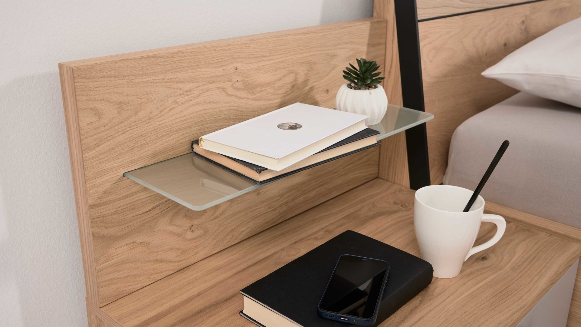 Die Kleiderschränke der Serie sind in drei unterschiedlichen Höhen erhältlich, sodass du sie optimal an die Raumhöhe deines Schlafzimmers anpassen kannst. Auch bei den Bettgestellen genießt du volle Gestaltungsfreiheit: Entscheide dich für ein klassisches Holz-Kopfteil oder ein gepolstertes Modell und kombiniere dein Wunschbett in verschiedenen Größen – ganz nach deinem Schlafkomfort und deinem Stil.