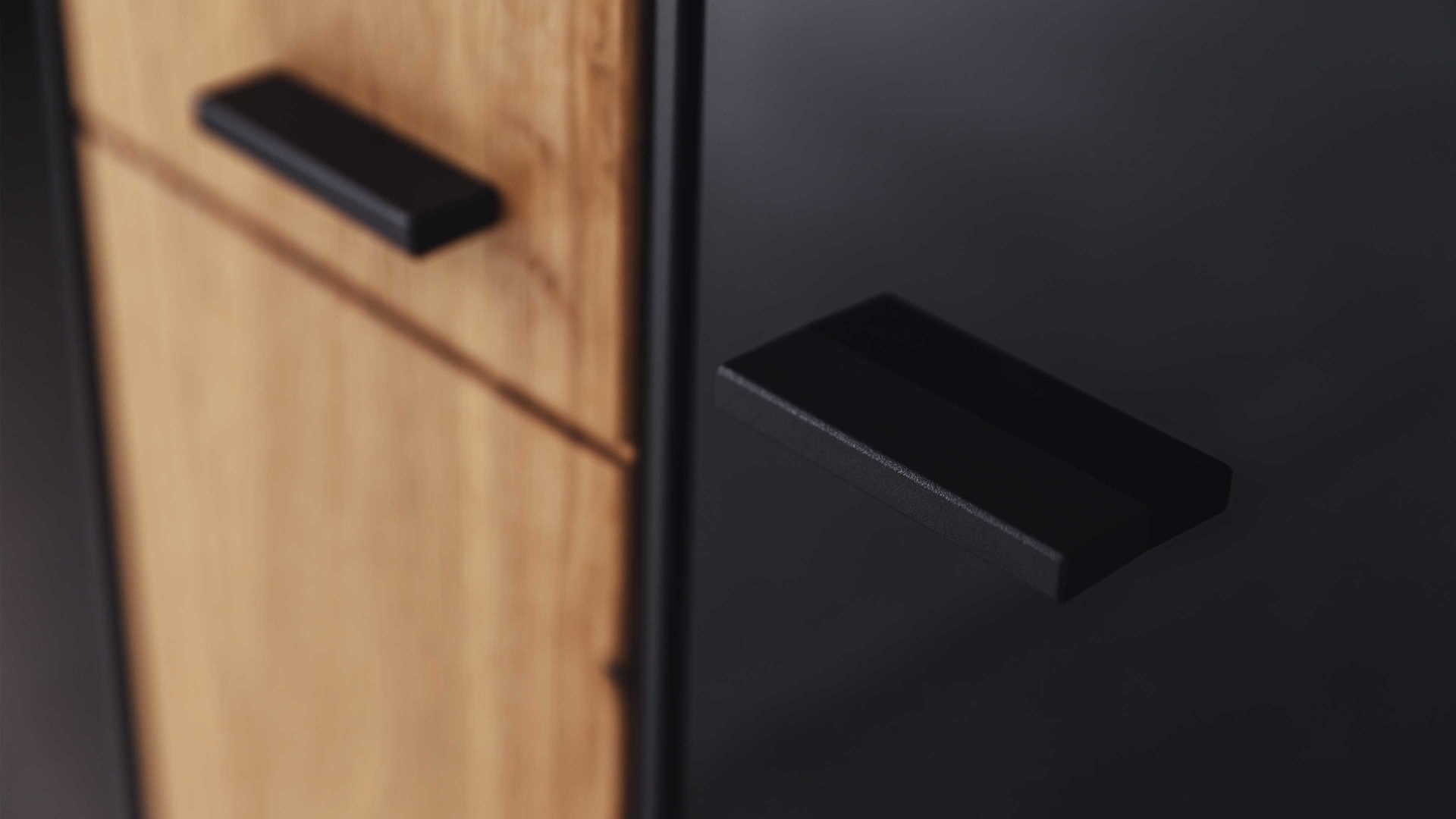 geölte Wildeiche, kombiniert mit geöltem Wildeiche-Furnier und anthrazitfarben lackierten Rückwänden