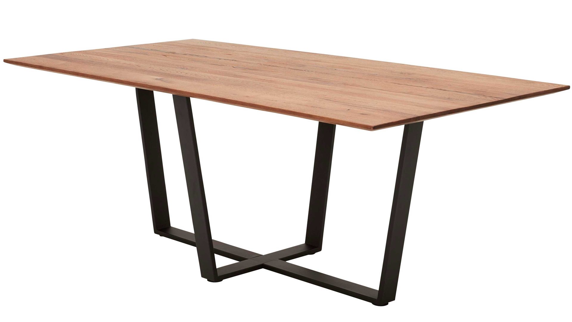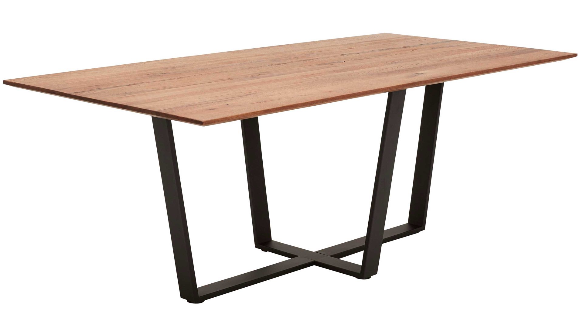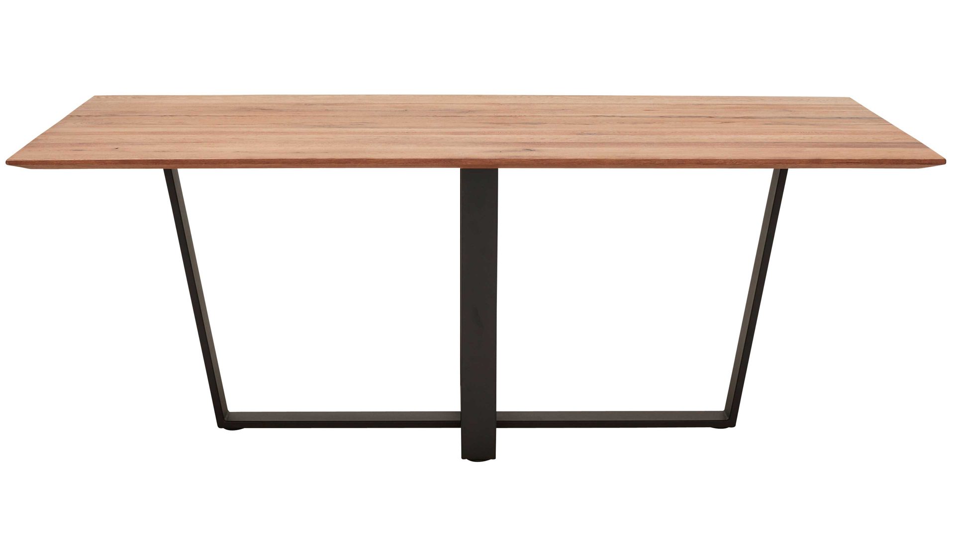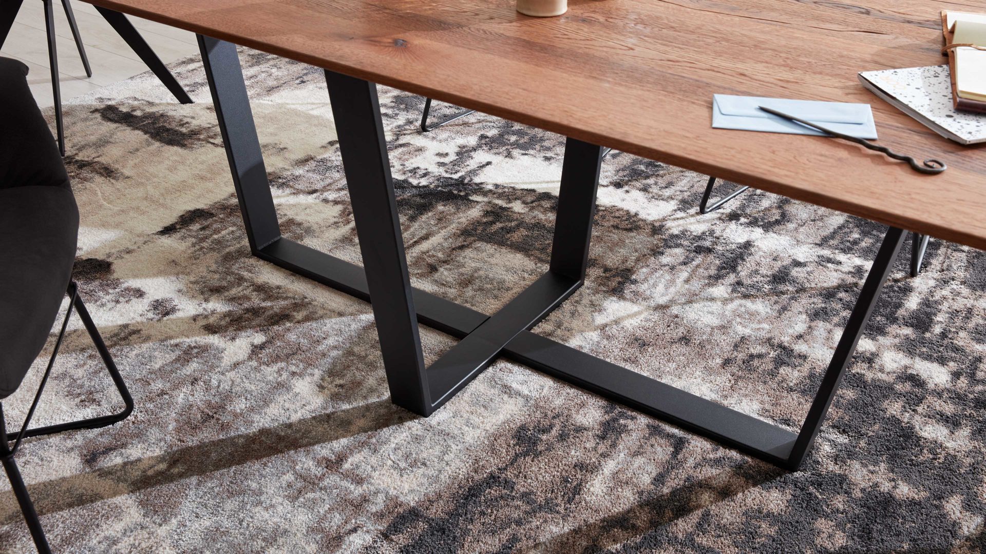 Für die optisch wie funktional perfekte Abrundung sorgt das schwarz pulverbeschichtete Eisen-Trapezkreuz. Mit dem Material unterstreicht es den massiven Charakter des Tisches, mit der Farbe setzt es einen modernen Akzent. Die Maße des Massivholztisches belaufen sich auf ca. 100 x 76 x 200 cm (BxHxL).