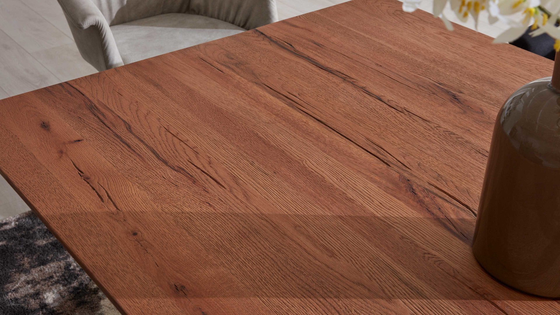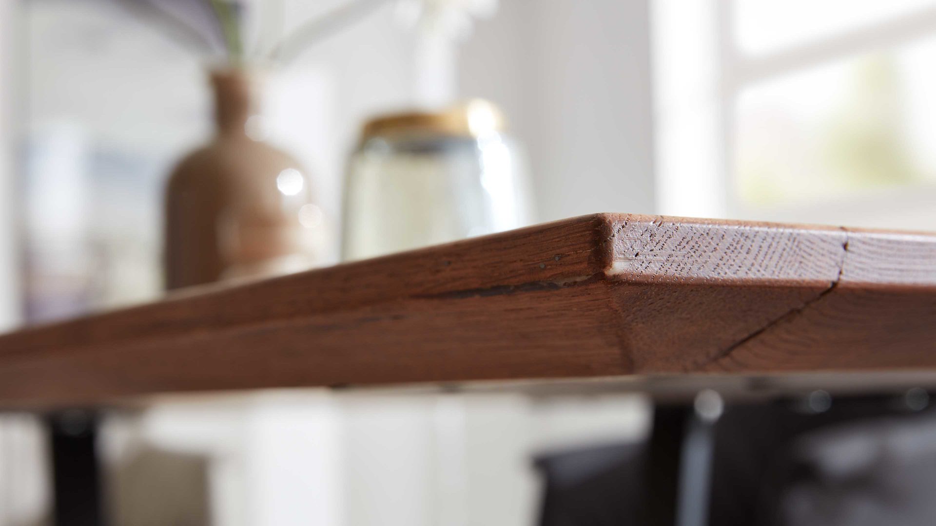 Der Esstisch 7073 aus der Interliving Esszimmer Serie 5107 ist erstklassig verarbeitet und ausgesprochen stilvoll designt. Durch die markante Tischplatte aus edel-antikfarbener Balkeneiche, die strukturgehobelt ist mit natürlichen Wuchsmerkmalen und Ästen, verkörpert der Holztisch ausdrucksstarke Natürlichkeit und ansprechende Rustikalität. Er strahlt Wärme und Eleganz aus. Die Plattenstärke beträgt ca. 30 mm. Zu den Highlights gehört weiterhin die Facettenkante.