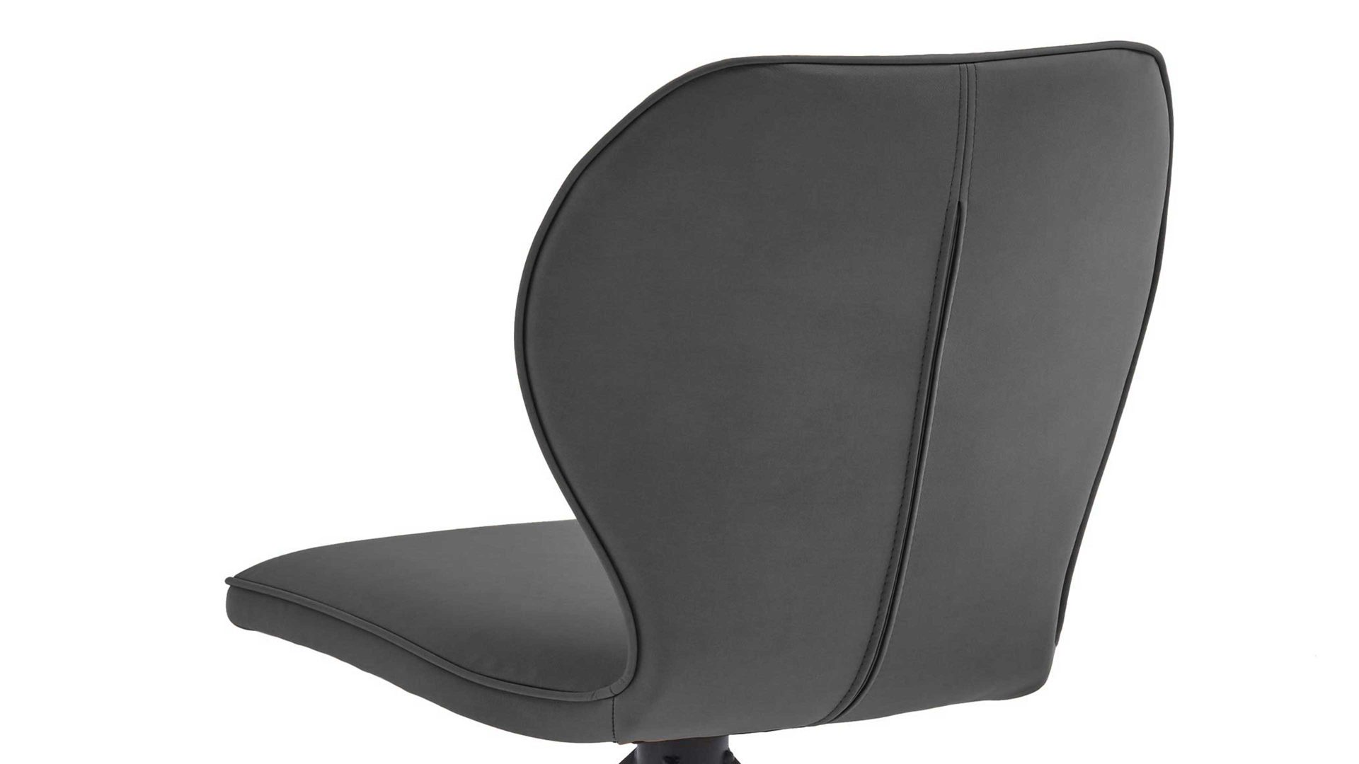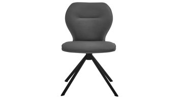 Er kombiniert ein mattschwarz lackiertes Stativgestell aus robustem Eisen mit einem graphitfarbene Mikrofaserbezug in Lederoptik und fügt sich in verschiedene Wohnstile harmonisch ein. Zu den optischen Highlights des Esszimmerstuhls gehört neben der Formensprache und den perfekt aufeinander abgestimmten Farben der markante Quereinzug im Rücken.