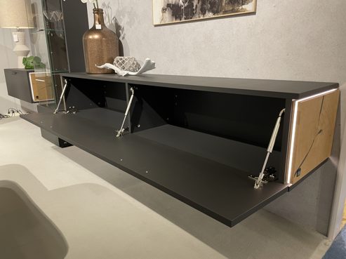 Das Hängeelement 1310 ist mit einer Klapptür ausgestattet. Seine Maße betragen ca. 92 x 32 x 38 cm (BxHxT). Als optisches Highlight fungieren die Hirnholz-Applikationen an den Außenseiten.
