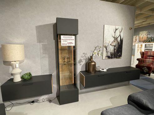 Die dreiteilige Wohnwand K052 aus der Interliving Wohnzimmer Serie 2023 besteht aus zwei Hängeelementen und einer hohen Standvitrine. Durch den carbongrauen Mattlack strahlen die Wohnmöbel moderne Eleganz aus. Für das gewisse Etwas sorgen Klarglaseinsätze und Applikationen aus urwüchsigem Hirnholz. Haptisch gebürstete Aluminiumgriffe in Carbongrau runden das stilvolle Design harmonisch ab. Die Gesamtmaße der Wohnkombination belaufen sich auf ca. 349 x 194 x 38 cm (BxHxT).